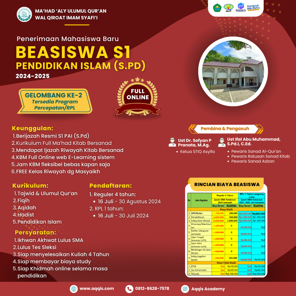 Pendaftaran Kuliah Online S1 Pendidikan Islam (S.Pd) Tahun Ajaran 2024/2025. Periode Pendaftaran: – 16 Juli – 30 Oktober 2024 (Reguler 4 Tahun). KBM Full Online via E-learning. DAFTAR DISINI Dapatkan segera DAFTAR DISINI Keunggulan Program: 1. Berijazah Resmi S1 PAI (S.Pd) 2. Kurikulum Full Ma’had Kitab Bersanad 3. Mendapat Ijazah Riwayah Kitab Bersanad 4. KBM Full […]